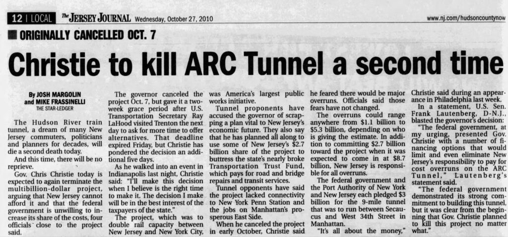 The decade’s most consequential project was the Access to the Region’s Core (ARC) tunnel, a proposed $8.7 billion commuter rail link between Secaucus Junction and Manhattan. Backed by federal, Port Authority, and state funds, ARC promised to double trans-Hudson rail capacity. Construction began in 2009, but by 2010, cost projections had risen to nearly $11 billion, and Governor Chris Christie, citing the risk of overruns and the state’s lack of funds, canceled the project. The decision forfeited federal funding, redirected Port Authority money to highway projects, and left New Jersey with a critical capacity shortfall that persists to this day.