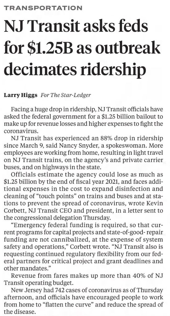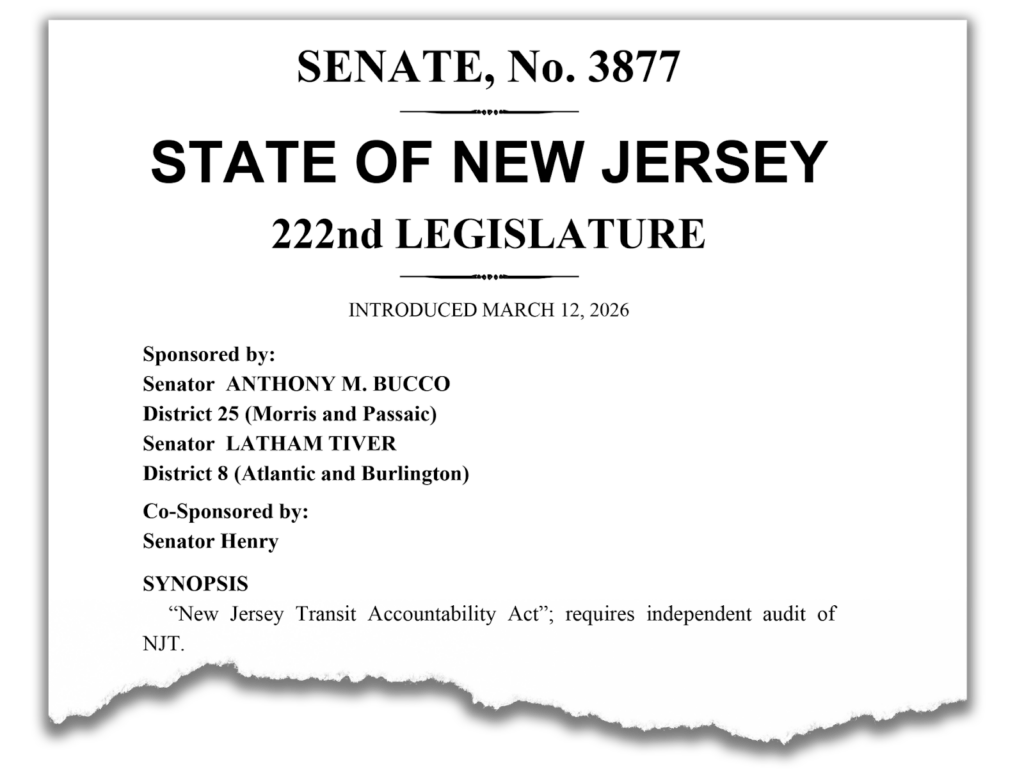 In March 2026, NJ Senate bill S3877 “The New Jersey Transit Accountability Act” was introduced in the NJ Senate, co-sponsored by Senators Bucco, Tiver, and Henry. The legislation mandates an independent audit of NJ Transit’s financial and budget practices since 2018. It aims to increase transparency regarding capital fund diversions and the pandemic’s impact on service demands.