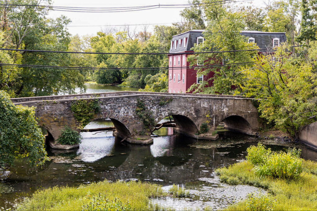 Right at the junction of Somerset, Middlesex, and Mercer counties, this bridge replaced a wooden span destroyed by the Continental Army during the Revolutionary War. Its four fieldstone arches once carried the Kingโs Highway, now Route 27. In 1960, local residents successfully fought to protect it from demolition.